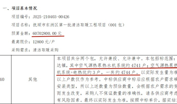 9393万预算,空气源热泵7701户,抚顺市东洲区第一批清洁取暖工程项目招标公告