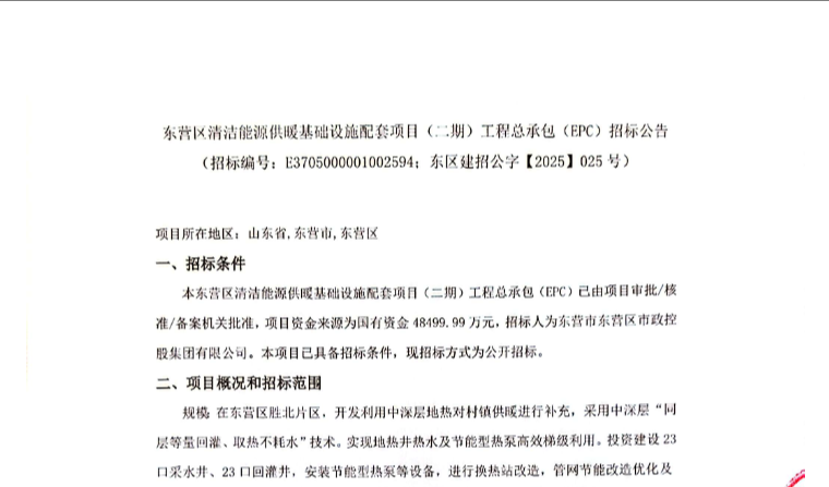总投资4.84亿,东营区清洁能源供暖基础设施 配套项目(二期)工程总承包 (EPC)招标公告