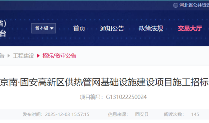 投标限价7.2亿,含空气源热泵280台。固安高新区供热管网基础设施建设项目施工招标公告