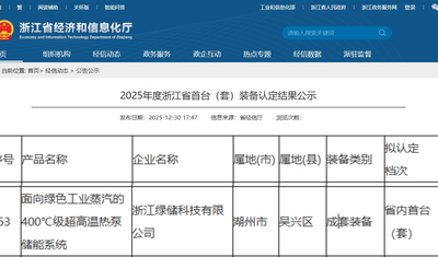 面向绿色工业蒸汽的400℃级超高温热泵储能系统入选2025年度浙江省首台(套)装备