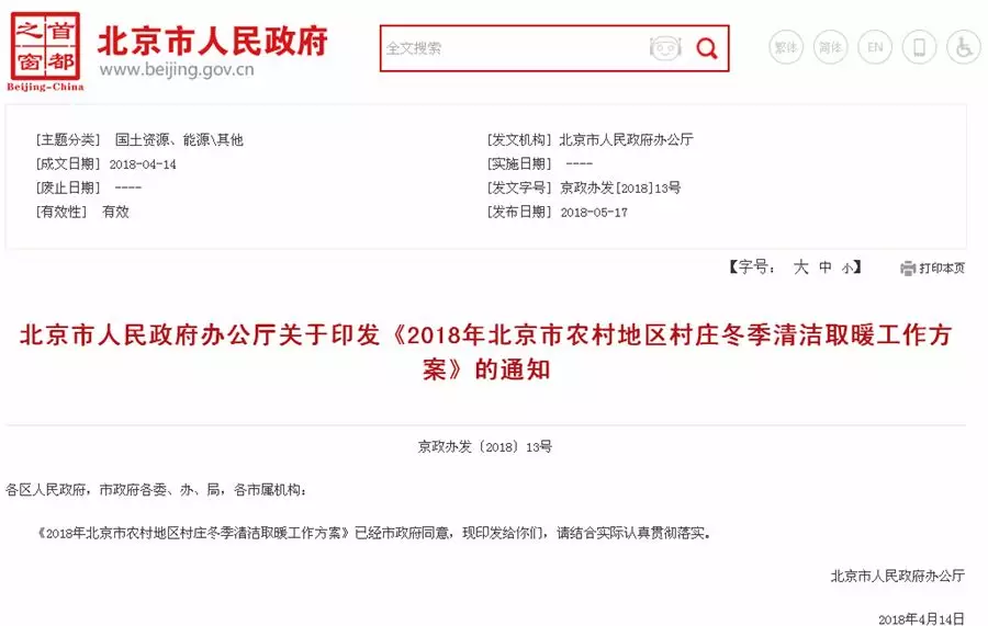 北京市人民政府办公厅关于印发《2018年北京市农村地区村庄冬季清洁取暖工作方案》的通知