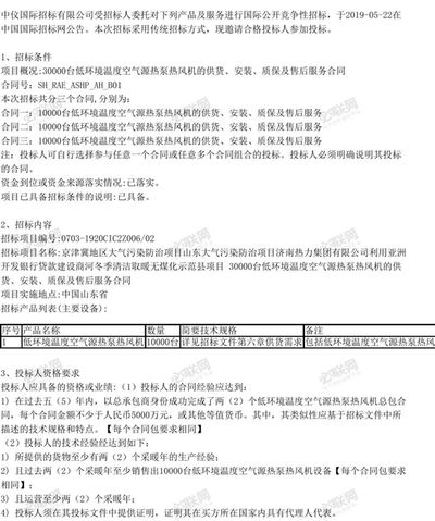 京津冀地区大气污染防治项目山东大气污染防治项目济南热力集团有限公司利用亚洲开发银行贷款建设商河冬季清洁取暖无煤化示范县项目 30000台低环境温度空气源热泵热风机的供货、安装、质保及售后服务合同国际招