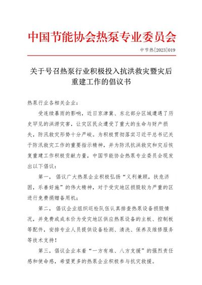关于号召热泵行业积极投入抗洪救灾暨灾后重建工作的倡议书