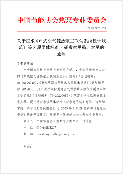 关于征求《户式空气源热泵三联供系统设计规范》等3项团体标准(征求意见稿)意见的通知