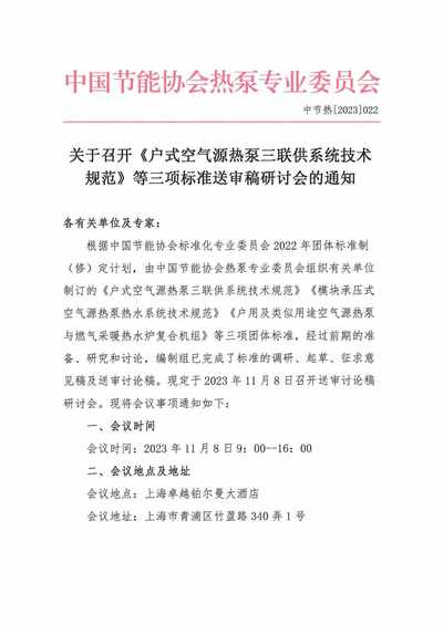 关于召开《户式空气源热泵三联供系统技术规范》等三项标准送审稿研讨会的通知