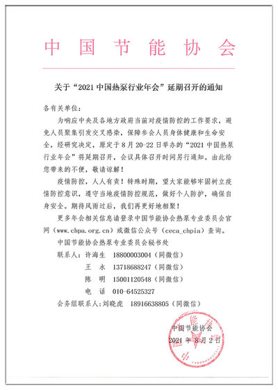 关于"2021中国热泵行业年会“延期召开的通知