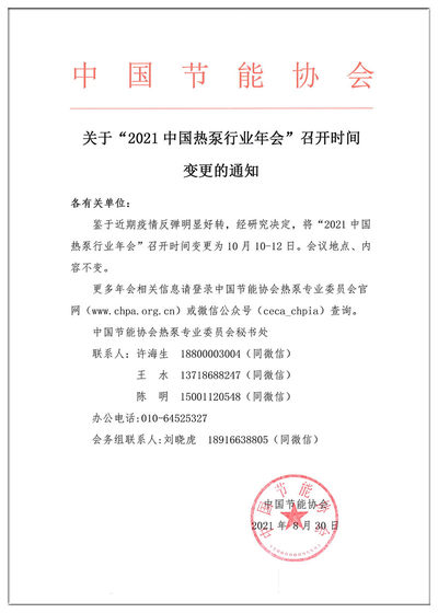 关于“2021中国热泵行业年会”召开时间变更的通知
