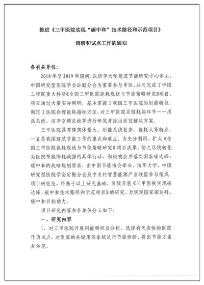 推进《三甲医院实现“碳中和”技术路径和示范项目》调研和试点工作的通知