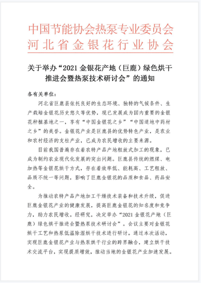 关于举办“2021金银花产地(巨鹿)绿色烘干推进会暨热泵技术研讨会”的通知
