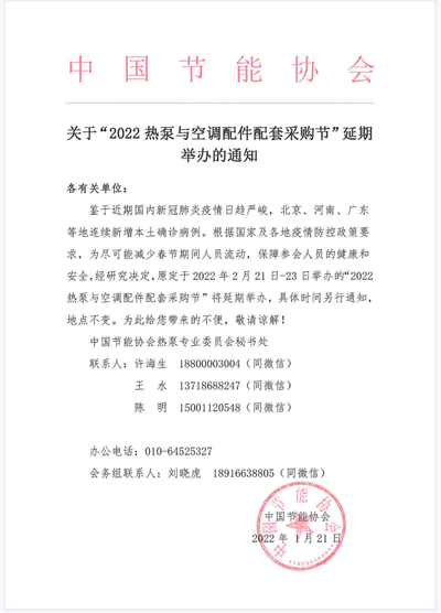 关于“2022热泵与空调配件配套采购节”延期举办的通知