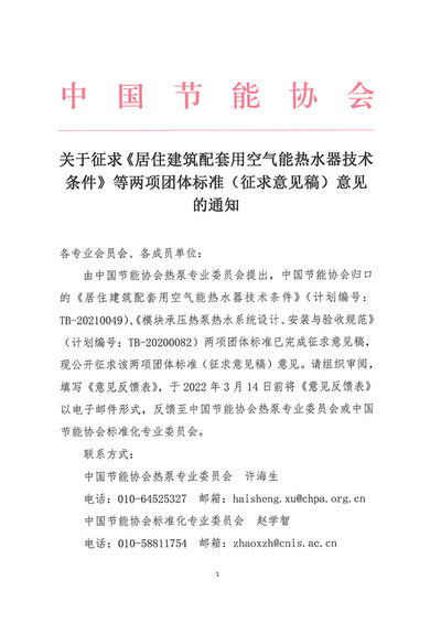 关于征求《居住建筑配套用空气能热水器技术条件》等两项团体标准(征求意见稿)意见的通知