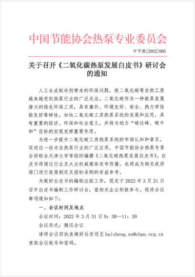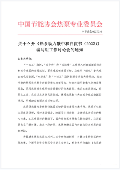 关于召开《热泵助力碳中和白皮书(2022)》编写组工作讨论会的通知