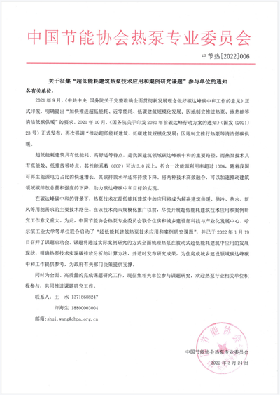 关于征集“超低能耗建筑热泵技术应用和案例研究课题”参与单位的通知