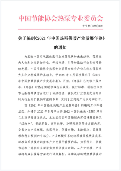 关于编制《2021年中国热泵供暖产业发展年鉴》的通知