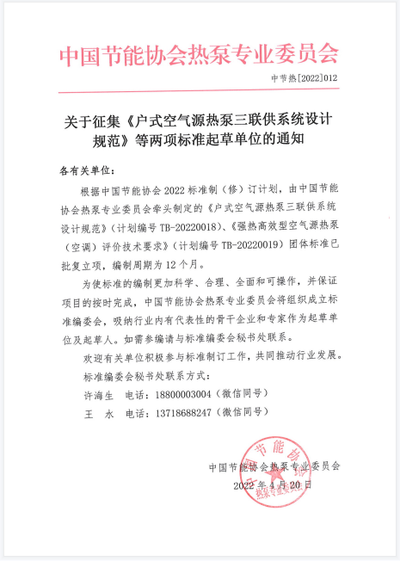 关于征集《户式空气源热泵三联供系统设计规范》等两项标准起草单位的通知