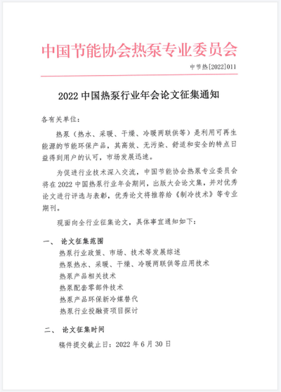 2022中国热泵行业年会论文征集通知