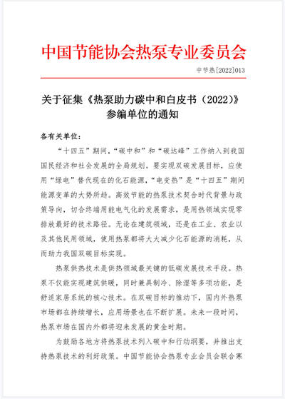 关于征集《热泵助力碳中和白皮书(2022)》参编单位的通知