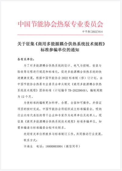 关于征集《商用多能源耦合供热系统技术规程》标准参编单位的通知