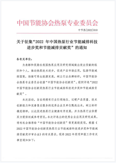 关于征集“2022年中国热泵行业节能减排科技进步奖和节能减排贡献奖”的通知