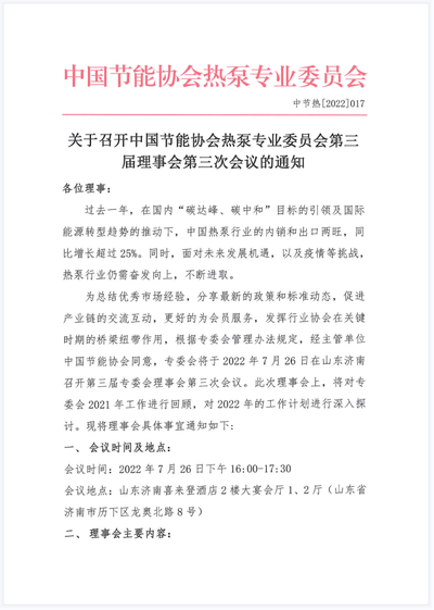 关于召开中国节能协会热泵专业委员会第三届理事会第三次会议的通知