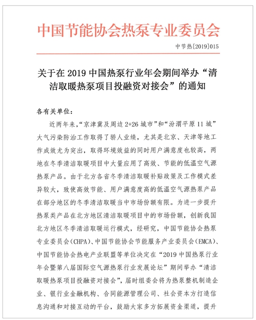 关于在2019中国热泵行业年会期间举办“清洁取暖热泵项目投融资对接会”的通知