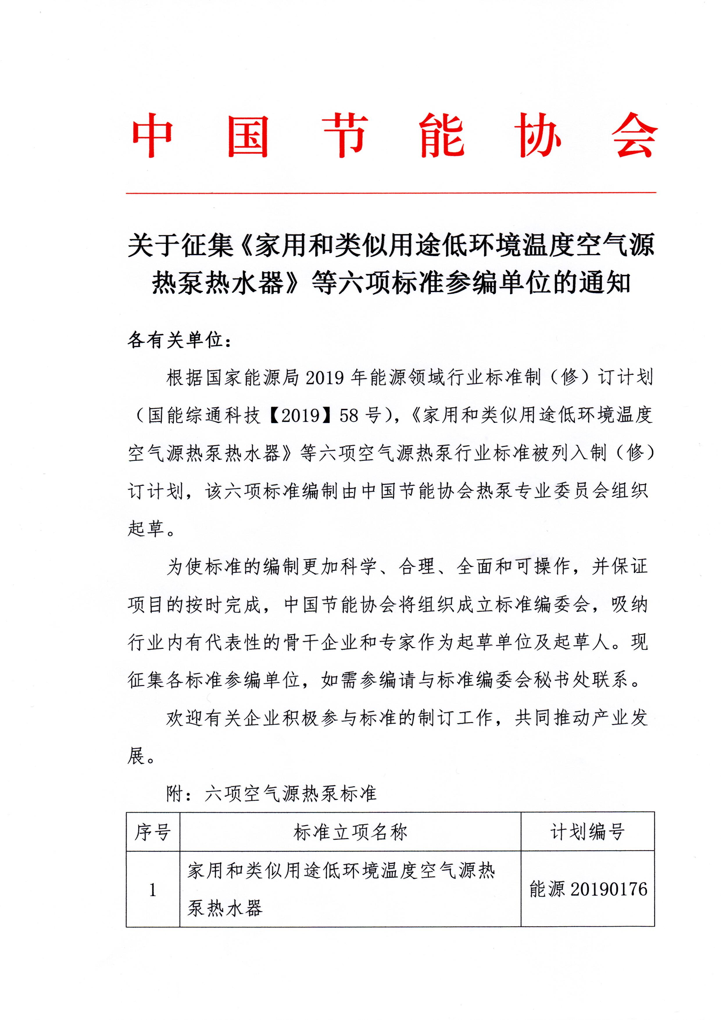 关于征集《家用和类似用途低环境温度空气源热泵热水器》等六项标准参编单位的通知