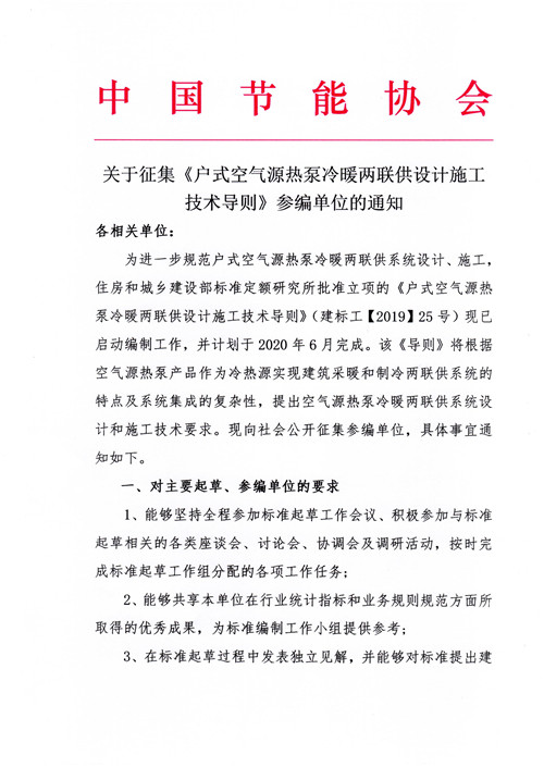 关于征集《户式空气源热泵冷暖两联供设计施工技术导则》参编单位的通知