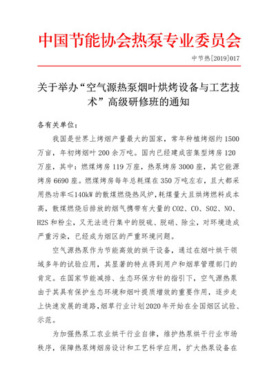 关于举办“空气源热泵烟叶烘烤设备与工艺技术”高级研修班的通知