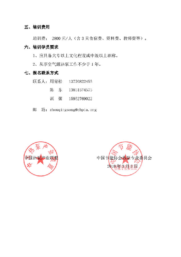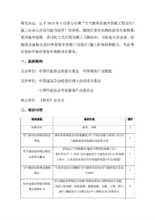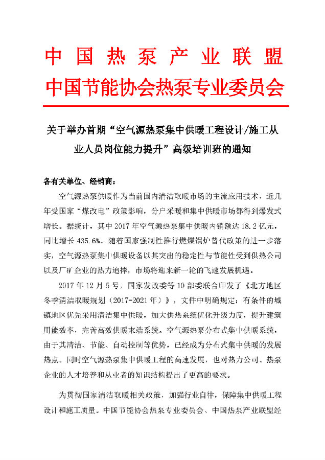 关于举办首期“空气源热泵集中供暖工程设计/施工从业人员岗位能力提升”高级培训班的通知