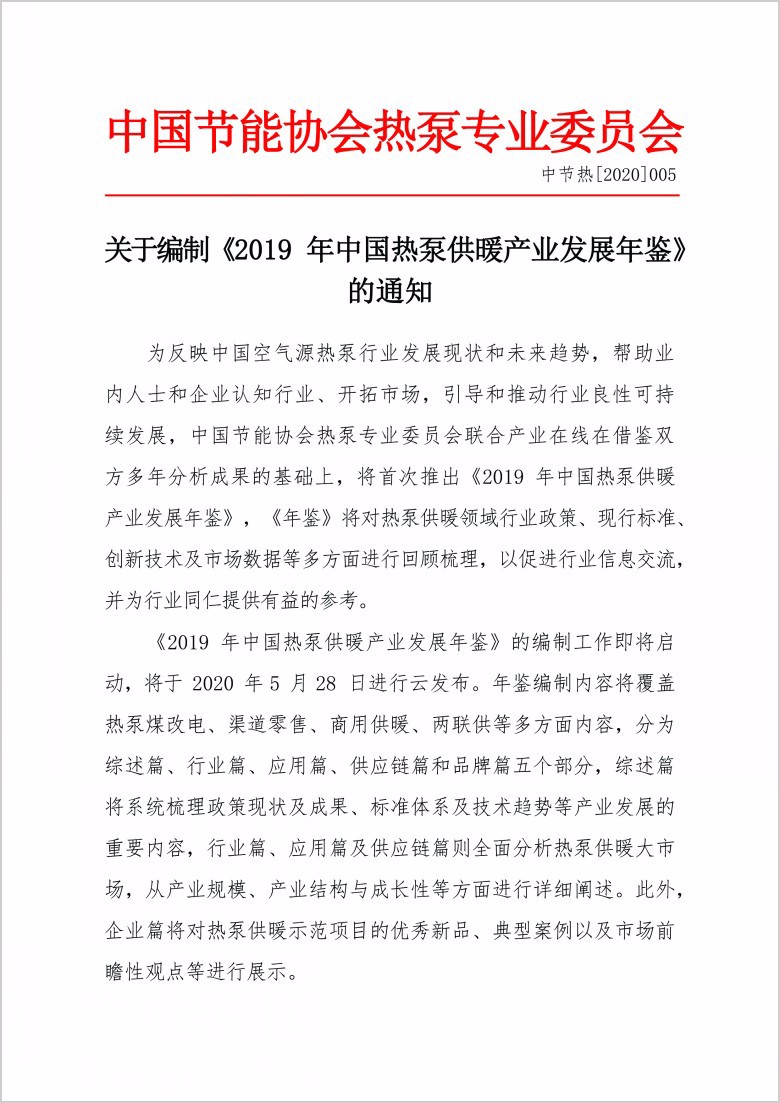 关于编制《2019年中国热泵供暖产业发展年鉴》的通知