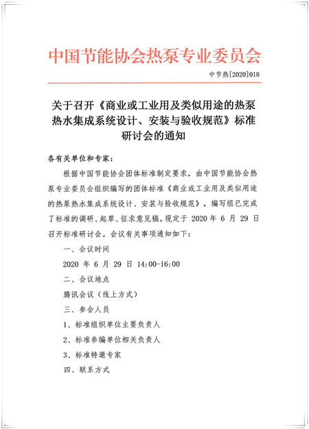 关于召开《商业或工业用及类似用途的热泵热水集成系统设计、安装与验收规范》标准研讨会的通知