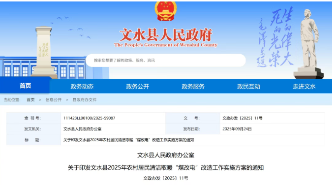 近日,吕梁市文水县人民政府发布《文水县2025年农村居民清洁取暖“煤改电”改造工作实施方案》,方案中提到,文水县2025年清洁取暖“煤改电”任务涉及凤城镇、开栅镇、刘胡兰镇、下曲镇、西城乡、马西乡6个乡镇22个村9596户居民。其中,推荐使用并实行奖补的“煤改电”采暖设备为空气能热泵和热风机两类,该两类设备在便捷性、节能性和使用成本方面优于其他类型采暖设备。并对对积极实施“煤改电”清洁取暖改造的居民用户实行财政奖补政策。具体措施为:1、空气能热泵设备2025年10月31日前购置的奖励2500元/户,2025年11月30日前购置的奖励2000元/户,2025年12月31日前购置的奖励1500元/户;热风机设备2025年12月31日前购置的,统一奖励1000元/户;奖补日期截至2025年12月31日。2、对2025年清洁取暖“煤改电”集中推进区域范围内的居民用户,执行居民采暖“煤改电”电价优惠政策,用电价格按照省级价格主管部门规定标准执行。