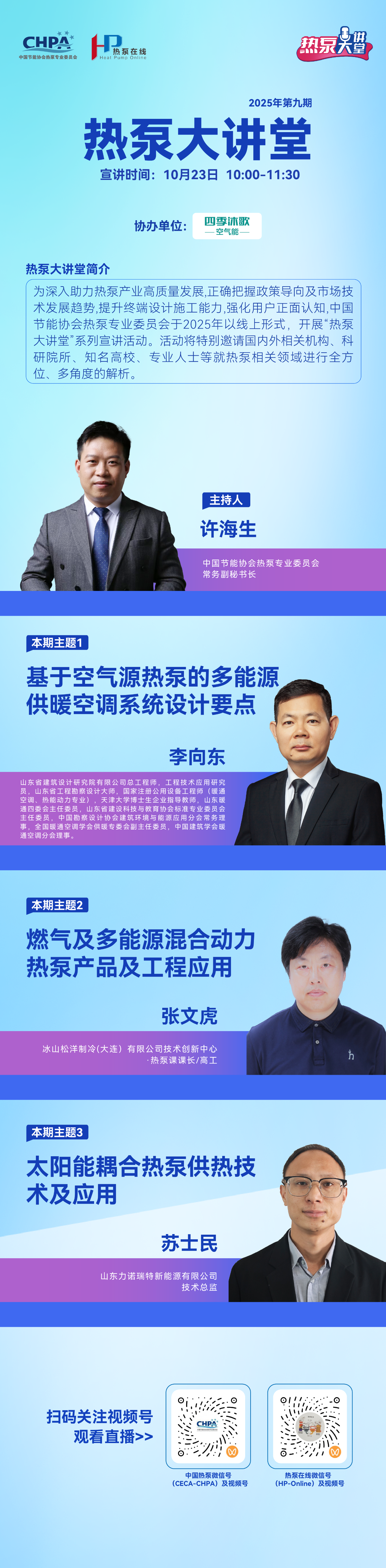 本期邀请了山东省建筑设计研究院有限公司总工程师李向东分享报告《基于空气源热泵的多能源供暖空调系统设计要点》、冰山松洋制冷(大连)有限公司技术创新中心高工张文虎分享报告《燃气及多能源混合动力热泵产品及工程应用》 、山东力诺瑞特新能源有限公司技术总监苏士民分享报告《太阳能耦合热泵供热技术及应用》。届时欢迎大家通过中国热泵视频号(CECA-CHPA)或热泵在线视频号(HP-Online)收看,详情如下: