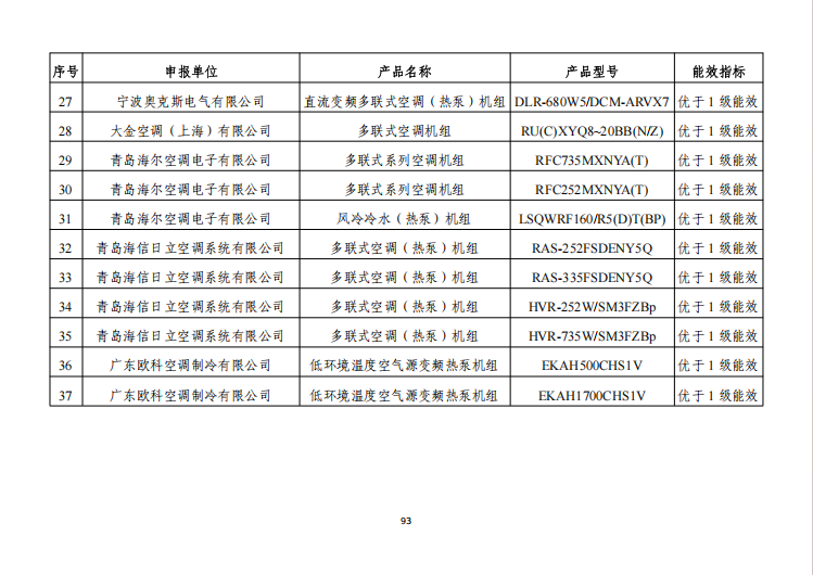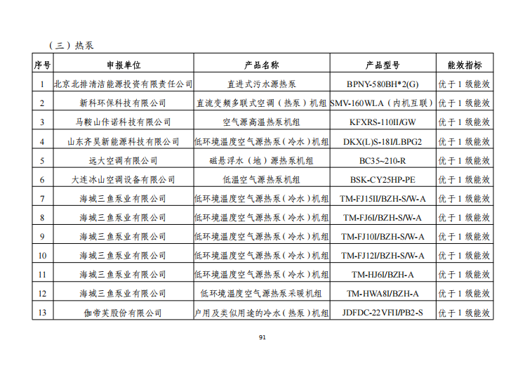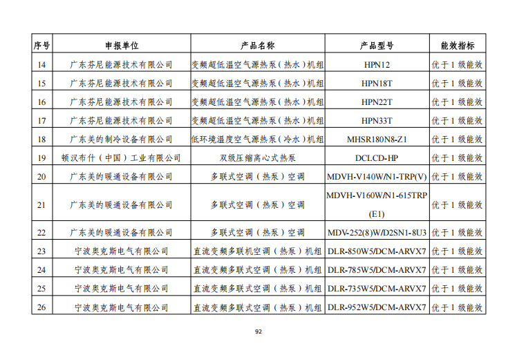 美的、海信日立、芬尼、奥克斯、海尔、大金、欧科、伽帝芙、大连冰山、佧诺等企业热泵设备入选工信部高效节能装备目录。