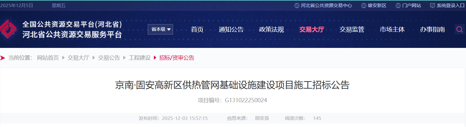 京南 ·固安高新区供热管网基础设施建设项目 已由 固安县发展和改革局 以 固安县发展和改革局 关于京南 ·固安高新区供热管网基础设施建设项 目初步设计的批复 , 固发改投资〔 2025〕44 号 批 准建设,建设资金来自 财政资金 ,国有资金占比 100% ,财 政资金占比 100% 。