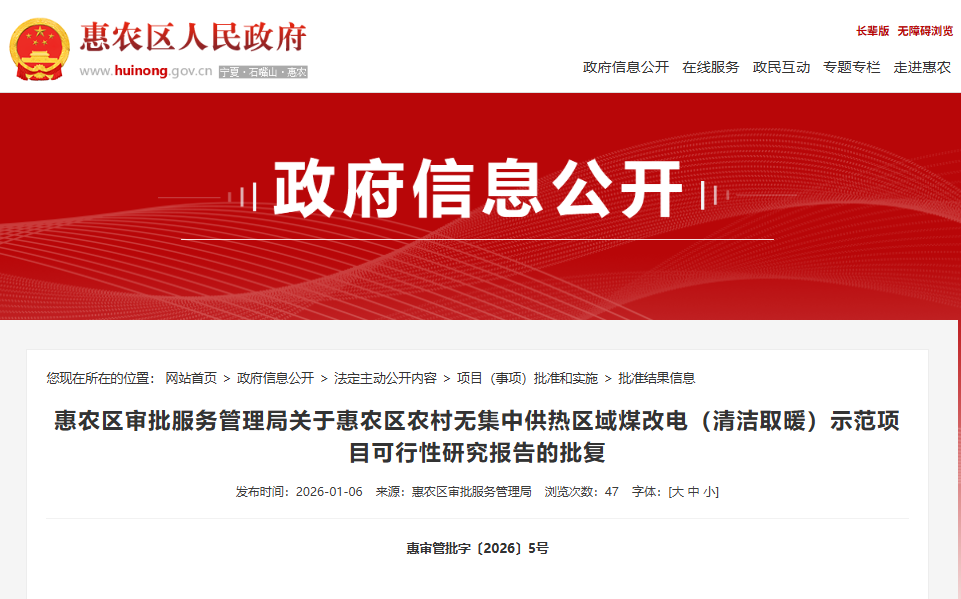 你单位报来《惠农区住房城乡建设和交通局关于<惠农区农村无集中供热区域煤改电(清洁取暖)示范项目可行性研究报告>的申请》(惠住建交通函〔2026〕2号)及其附件收悉。为进一步提高居民冬季采暖清洁化水平,促进大气环境质量进一步改善,经研究,同意该可行性研究报告,现将相关事宜批复如下: