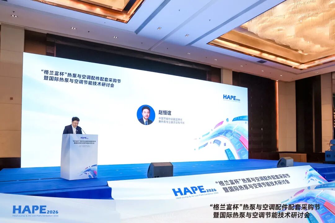 为深入贯彻落实《推动热泵行业高质量发展行动方案》要求,进一步推动热泵产业提质升级,提升热泵整机和关键零部件设计水平,1月15日上午,由中国节能协会热泵专业委员会主办的HAPE2026“格兰富杯”热泵与空调配件配套采购节隆重启幕。本届采购节以“聚力热泵高质量发展,凝心共赴双碳新征程”为主题,来自热泵与空调行业领导、专家,主机及配件企业领导、技术、采购负责人等逾千人齐聚一堂。