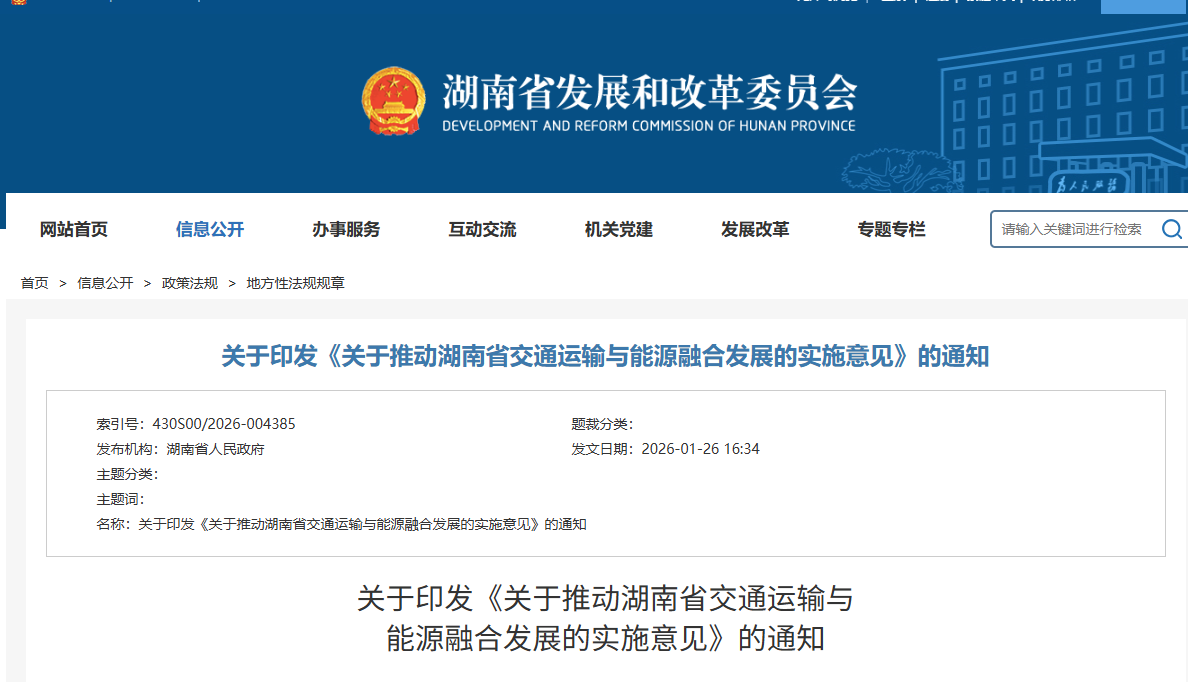 近日,湖南省发展和改革委员会、湖南省科学技术厅、湖南省工业和信息化厅、湖南省自然资源厅、湖南省住房和城乡建设厅 、湖南省交通运输厅、湖南省市场监督管理局、湖南省能源局印发《关于推动湖南省交通运输与能源融合发展的实施意见》。