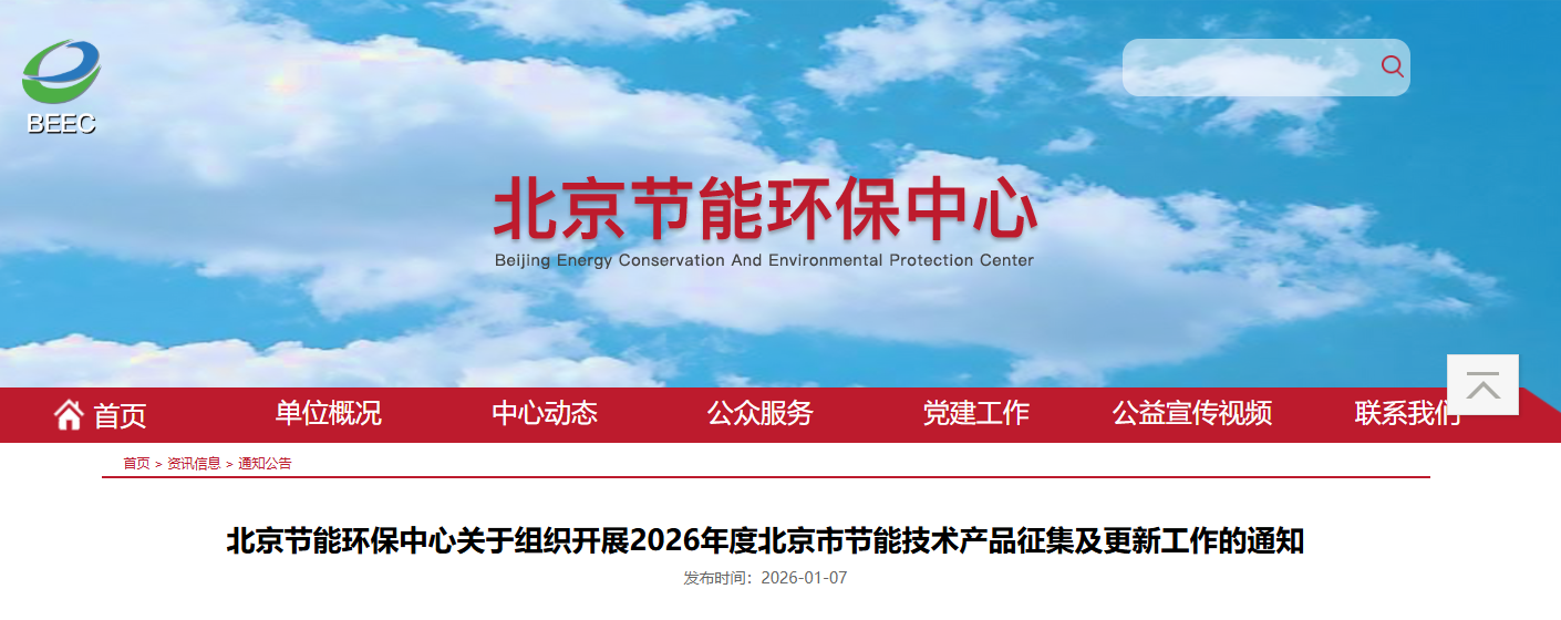 为加快推广本市先进适用的节能技术产品,促进节能降碳与绿色发展,根据《北京市实施〈中华人民共和国节约能源法〉办法》有关要求,受北京市发展和改革委员会委托,北京节能环保中心组织开展2026年度北京市节能技术产品征集及更新工作,现将有关事项通知如下:
