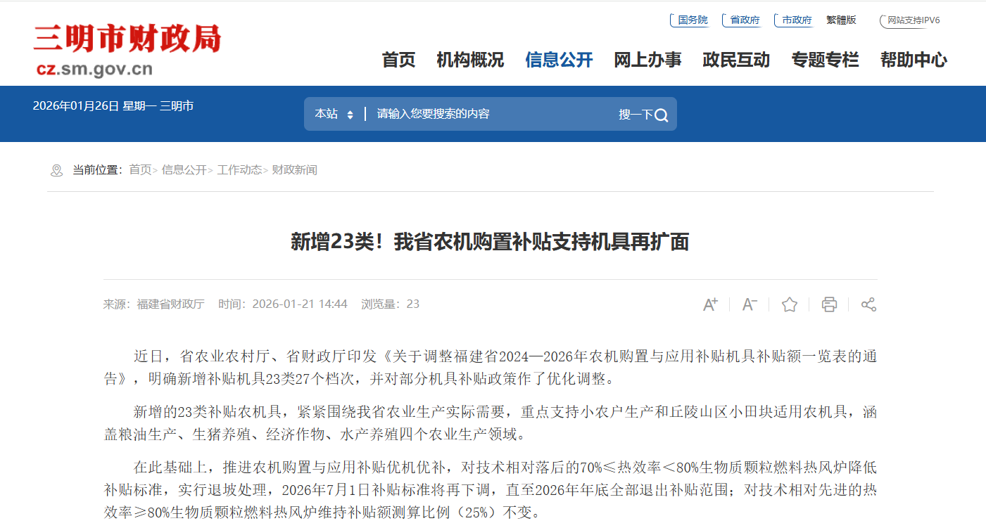 近日,省农业农村厅、省财政厅印发《关于调整福建省2024—2026年农机购置与应用补贴机具补贴额一览表的通告》,明确新增补贴机具23类27个档次,并对部分机具补贴政策作了优化调整。