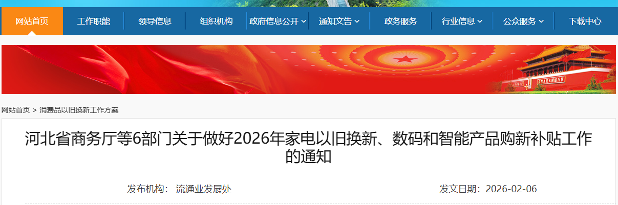 为深入落实党中央、国务院决策部署,更好发挥消费品以旧换新政策在惠民生、促消费方面的积极作用,按照《商务部等7部门关于提质增效实施2026年消费品以旧换新政策的通知》(商消费司函〔2025〕697号)《商务部等5部门办公厅(室)关于做好2026年家电以旧换新、数码和智能产品购新补贴工作的通知》(商办流通函〔2025〕469号)《河北省发展和改革委员会 河北省财政厅印发〈关于做好2026年实施大规模设备更新和消费品以旧换新实施方案〉的通知》(冀发改环资〔2026〕91号)有关要求,现就做好2026年家电以旧换新、数码和智能产品购新补贴工作通知如下: