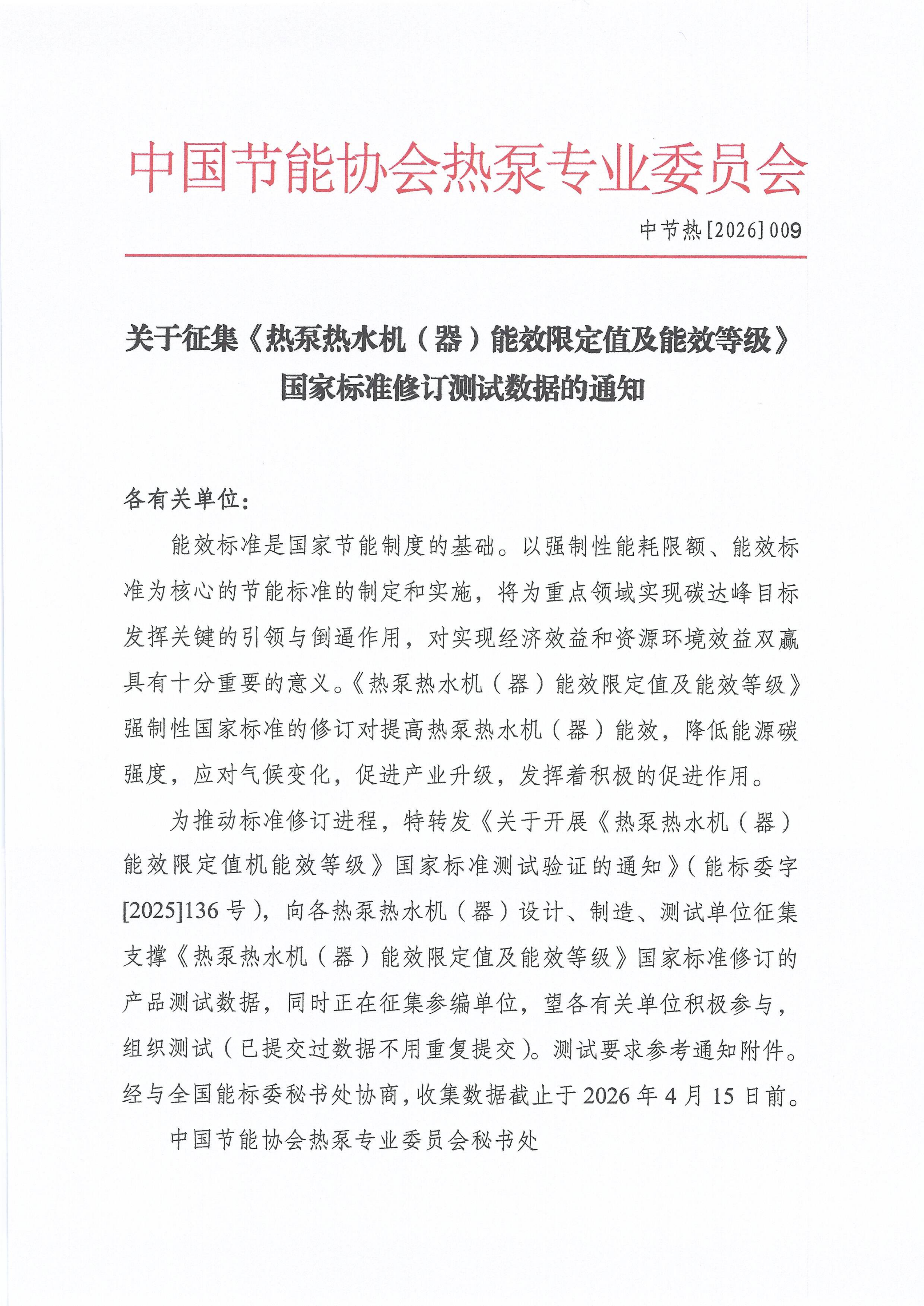 关于征集《热泵热水机 (器)能效限定值及能效等级》国家标准修订测试数据的通知
