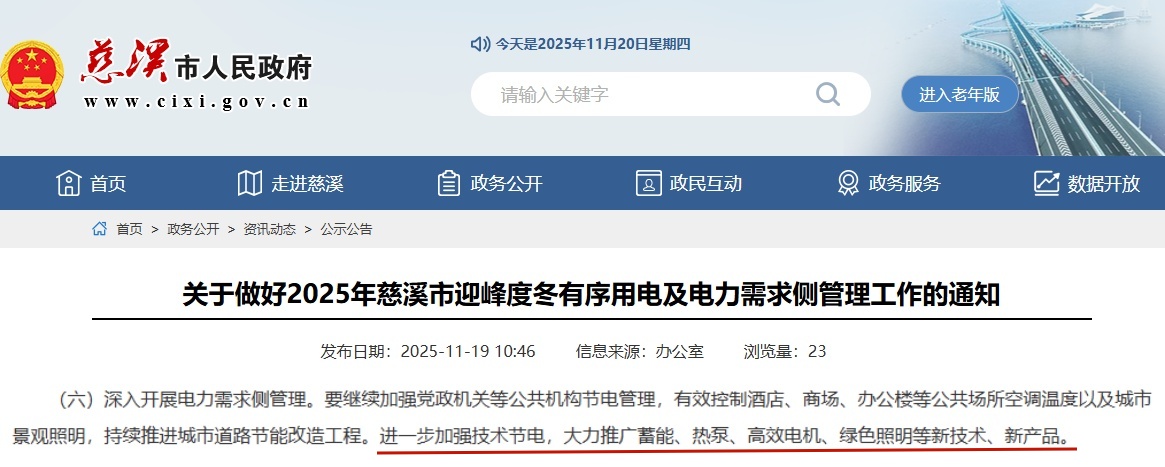 近日,浙江省慈溪市人民政府发布《关于做好2025年慈溪市迎峰度冬有序用电及电力需求侧管理工作的通知