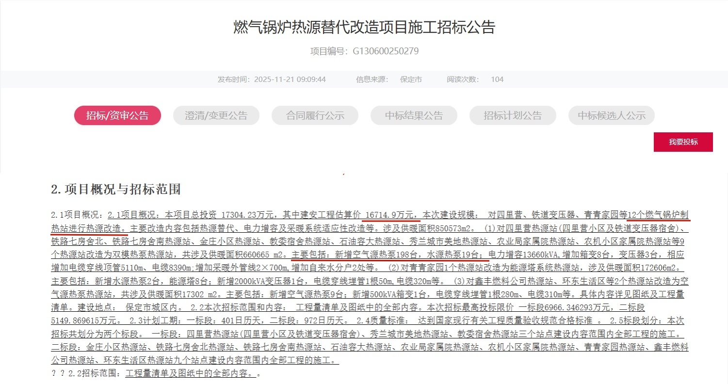 2.1项目概况:2.1项目概况:本项目总投资 17304.23万元,其中建安工程估算价 16714.9万元,本次建设规模: 对四里营、铁道变压器、青青家园等12个燃气锅炉制热站进行热源改造。主要改造内容包括热源替代、电力增容及采暖系统适应性改造等。涉及供暖面积850573m2。 (1)对四里营热源站(四里营小区及铁道变压器宿舍)、铁路七房舍北、铁路七房舍南热源站、金庄小区热源站、教委宿舍热源站、石油容大热源站、秀兰城市美地热源站、农业局家属院热源站、农机小区家属院热源站等9个热源站改造为双模热泵热源站,共涉及供暖面积660665 m2。主要包括:新增空气源热泵198台,水源热泵19台;电力增容13660kVA,增加箱变8台,变压器3台,相应增加电缆穿线顶管5110m、电缆8390m;增加采暖外管线2×700m,增加自来水分户2处等。 (2)对青青家园1个热源站改造为能源塔系统热源站,涉及供暖面积172606m2。主要包括:新增水源热泵2台,能源塔8台;新增2000kVA变压器1台,电缆穿线埋管1根50m,电缆320m等。 (3)对鑫丰燃料公司热源站、环东生活区等2个热源站改造为空气源热泵热源站,共涉及供暖面积17302 m2。主要包括:新增空气源热泵9台;新增500kVA箱变1台,电缆穿线埋管1根280m、电缆310m等。具体内容详见图纸及工程量清单。建设地点: 保定市城区内。 2.2本次招标范围和内容: 工程量清单及图纸中的全部内容。本次招标最高投标限价 一标段6966.346293万元,二标段5149.869615万元。 2.3计划工期:一标段:401日历天,二标段:972日历天。 2.4质量标准: 达到国家现行有关工程质量验收规范合格标准 。 2.5标段划分:本次招标共划分为两个标段。 一标段:四里营热源站(四里营小区及铁道变压器宿舍)、秀兰城市美地热源站、教委宿舍热源站三个站点建设内容范围内全部工程的施工。 二标段:金庄小区热源站、铁路七房舍北热源站、铁路七房舍南热源站、石油容大热源站、农业局家属院热源站、农机小区家属院热源站、青青家园热源站、鑫丰燃料公司热源站、环东生活区热源站九个站点建设内容范围内全部工程的施工。??2.2招标范围:工程量清单及图纸中的全部内容。。