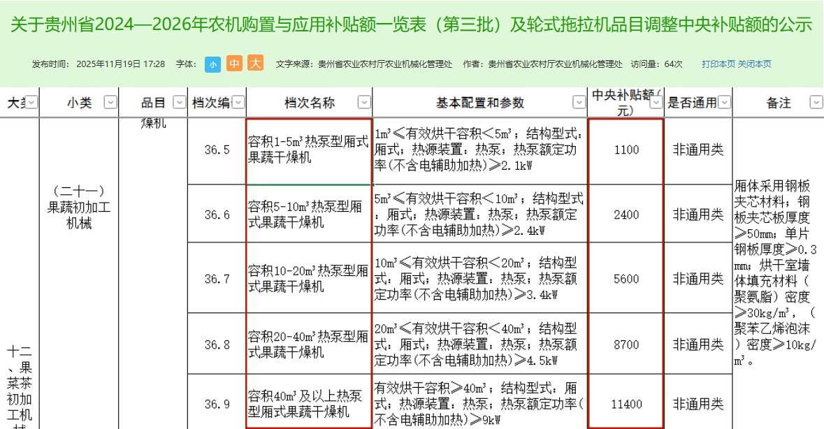 贵州省:购置与应用热泵型果蔬干燥机 按容积补贴1100元-11400元